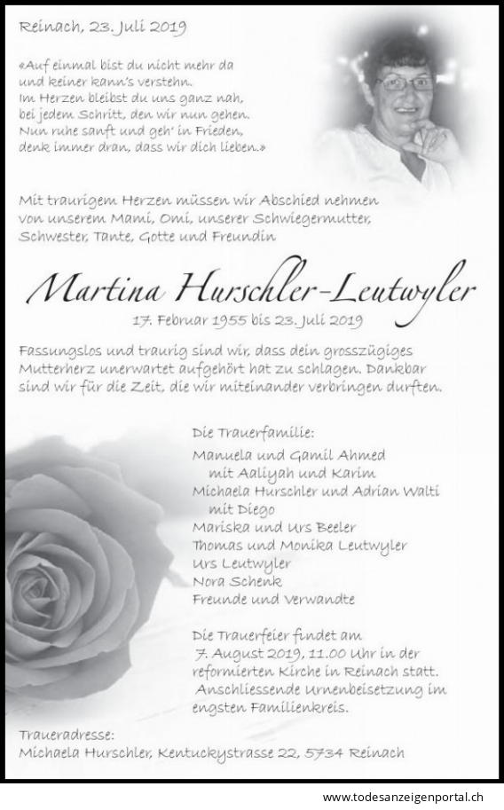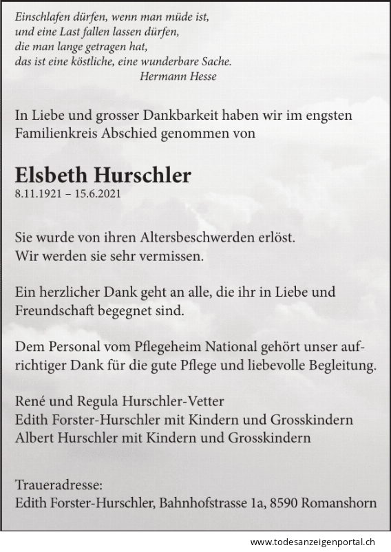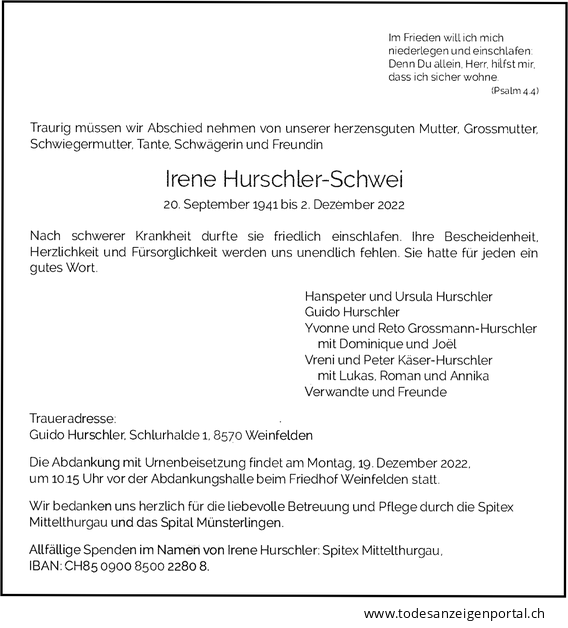 Pendenz 193 Maria Forster - Hurschler 04.04.1934 - 09.08.2022 |