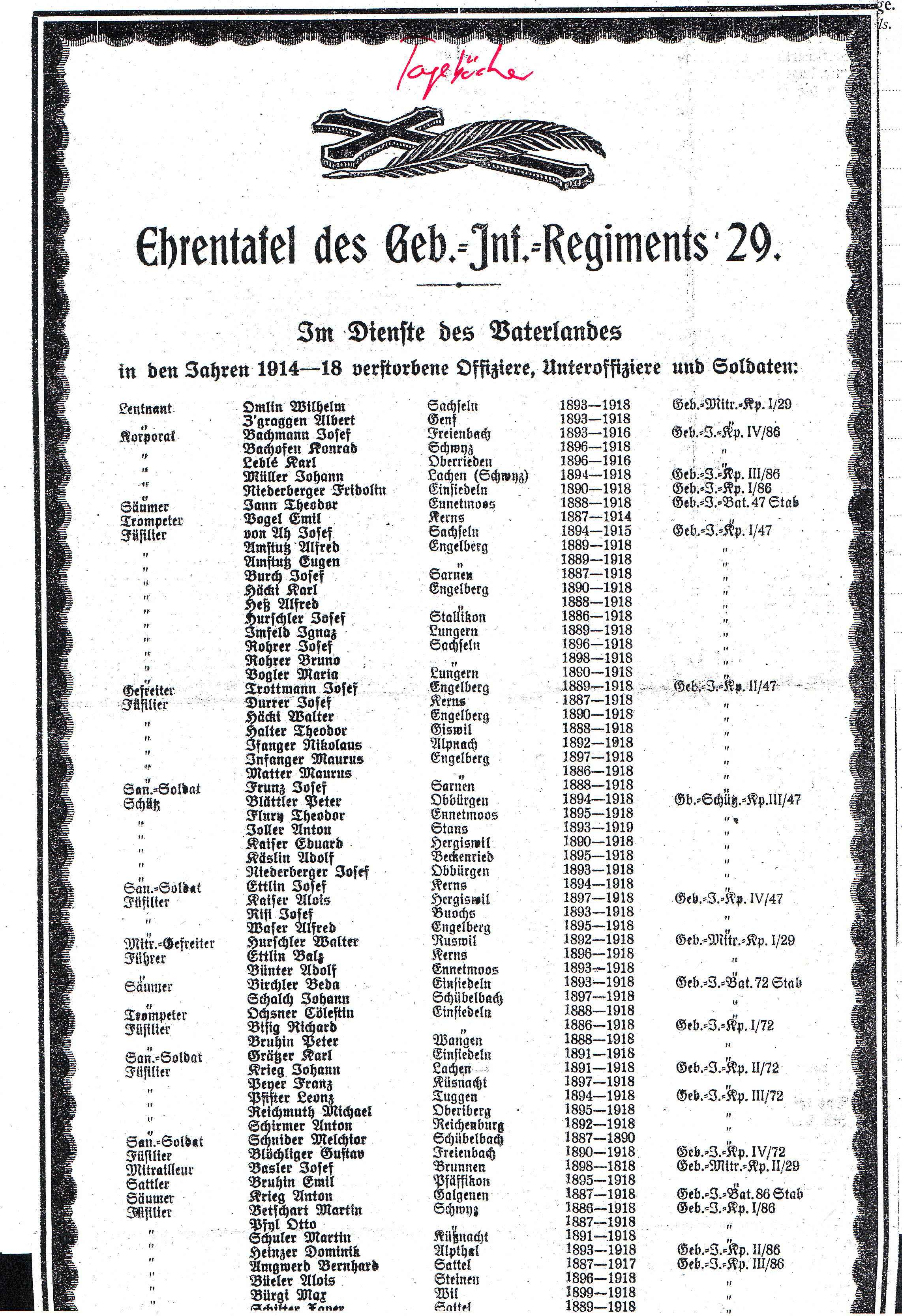 Zur gesuchten Person Josef Hurschler aus Stallikon habe ich folgende Unterlagen Auszug aus dem Zivilstandesamt und eine Ehrentafel des Geb Inf Regiment 29.