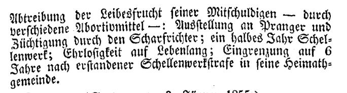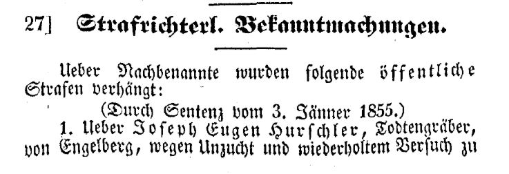 Joseph Eugen Hurschler, Todtengräber von Engelberg, wegen Unzucht und wiederholtem Versuch zu Abtreibung der Leibesfrucht seiner Mitschuldigen - durch verschiedene Abortivmittel-: Ausstellung an Pranger und Züchtigung durch den Scharfrichter; ein halbes Jahr Schellenwerk; Ehrlosigkeit auf Lebenlang; Eingrenzung auf 6 Jahre nach erstandener Schellenwekstrafe in seine Heimathgemeinde.